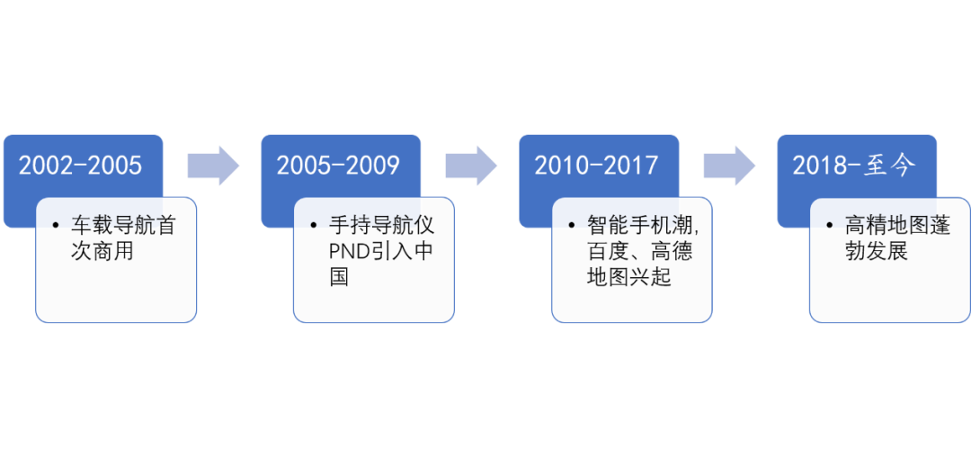 中国有电子地图来导航的这20年间,共经历了四个发展阶段,由于自动驾驶需求的兴起,高精地图自2018年开始蓬勃发展。