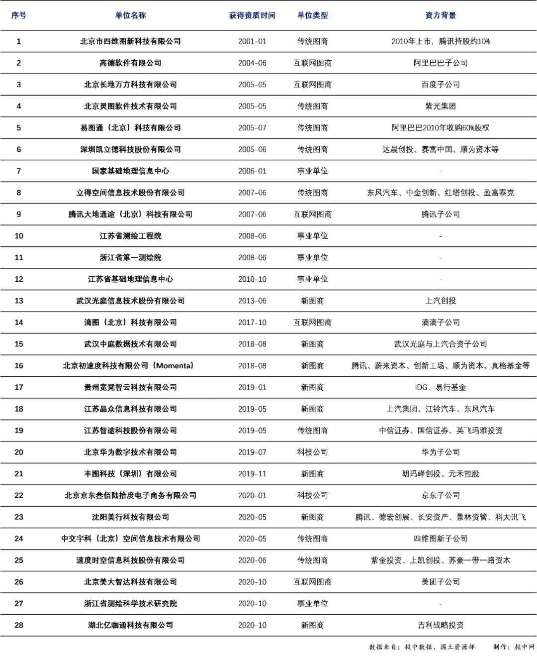 投中网统计发现,2017年之前仅有13家图商获批导航电子地图制作资质,除了4家基本不参与民间商业活动的国家事业单位,BAT分别控制1-2家,其余大多是与互联网公司或者车企合作的传统图商。