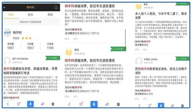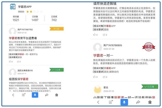 除了嗨学网,沪江网校、51talk等企业的投诉也不少。有个叫学霸君的APP最突出,光是在黑猫投诉上就收了1500多条“差评”,退款延迟、学费分期,黑点不少。