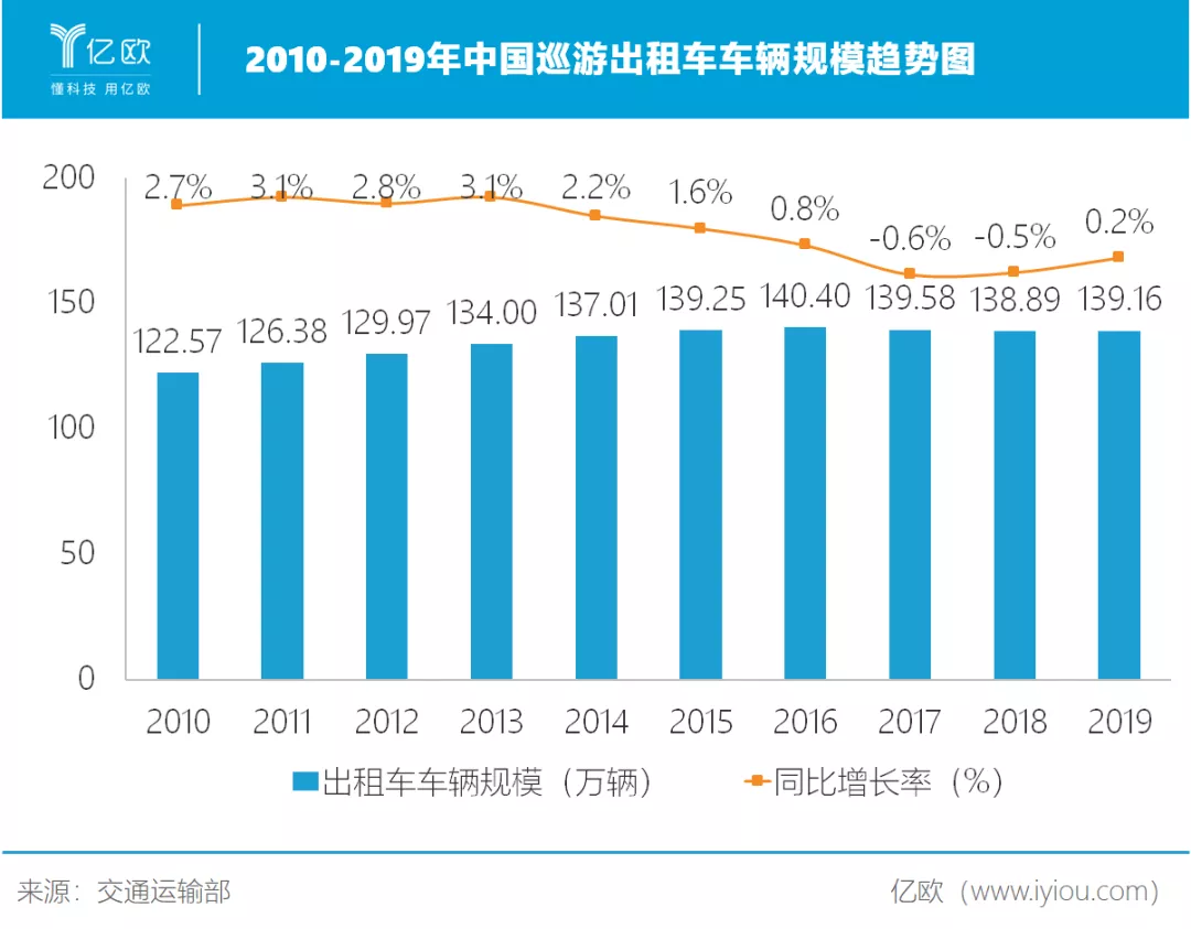 交通运输部的数据统计显示,2019年中国出租车车辆规模达139.16万辆,同比增长0.2%。另据F&S预测,2025年,出租车在中国四轮出行市场中仍会有约53.9%的份额。