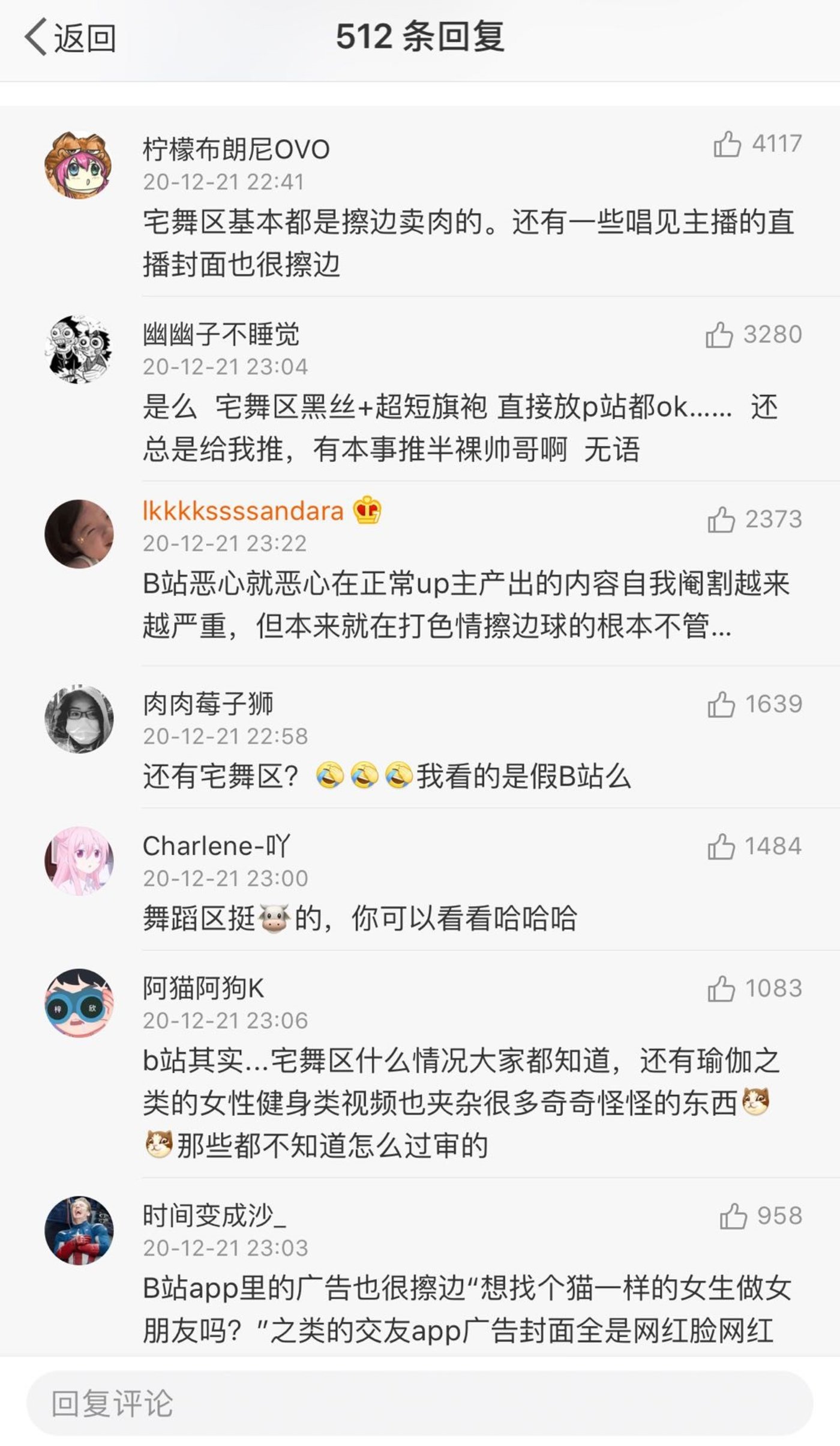 另一边的B站也付出了很大代价。去年12月,“B站因涉黄被约谈10余次”的话题登上微博热搜,重灾区正是新兴起的舞蹈区。该板块充斥着着大量打擦边球的内容,就连相关视频的弹幕也越来越“开放”。这引发B站老用户的声讨,“不知道怎么审核的”、“进B站舞蹈区就像是逛窑子”……