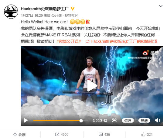 当日下午四点Hacksmith开始更新“MAKE IT REAL”系列视频,将漫画、电影和游戏中的创意通过微博带到中国粉丝面前,迅速引发网友围观,1月28日登顶视频社区全站日榜TOP1,视频播放量超225万。