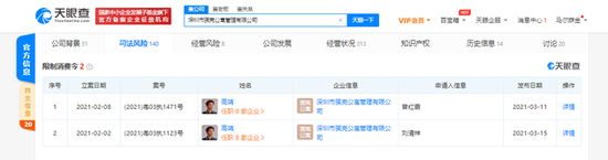 鞭牛士 3月19日消息,天眼查App显示,近日,蛋壳公寓关联公司深圳市蛋壳公寓管理有限公司新增两条限制消费令信息,案号为(2021)粤03执1471号、(2021)粤03执1123号,立案日期分别为2021年2月8日、2021年2月2日,限制人员为该公司CEO及其法定代表人高靖。