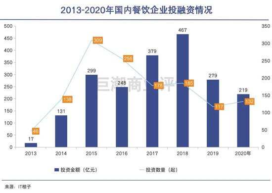 IT桔子数据显示,我国餐饮行业的投资金额从2013年开始一路飙升,2018年-2020年三年,投资金额都保持在200亿以上。