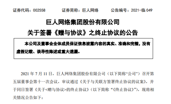 鞭牛士 7月12日消息,巨人网络今日发布公告称,6月11日,公司及巨道网络与巨人投资签署了《赠与协议》。