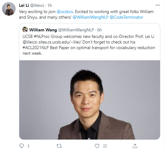 对于该消息,李磊表示:非常激动加入UCSB,也非常高兴和威廉等学者一起工作。