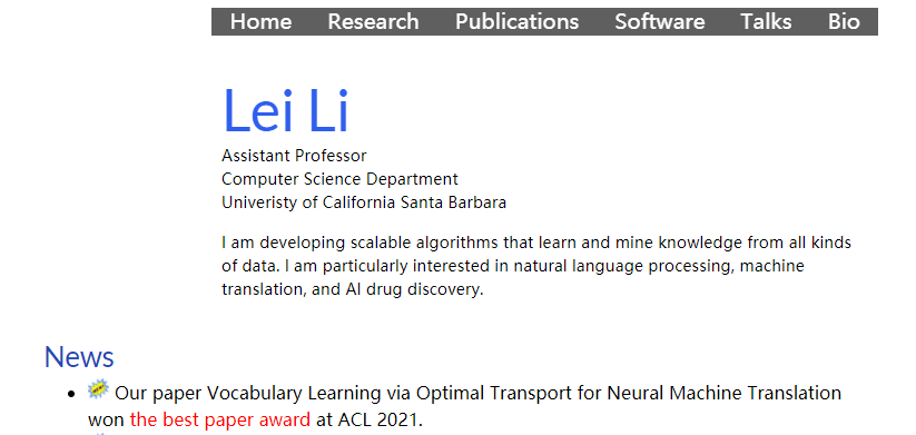 值得一提的是,就在刚刚结束的ACL 2021会议上,李磊作为通讯一作发表的“Vocabulary Learning via Optimal Transport for Neural Machine Translation”论文被组委会评为最佳论文。截止目前,他已在机器学习、数据挖掘和自然语言理解领域于国际顶级学术会议发表论文40余篇。