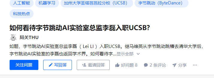 至于为什么入职加州大学圣巴巴拉分校,知乎上有网友讨论,“字节不得人心”、“AI的产出不尽如人意”、“对学术真理的追求”....