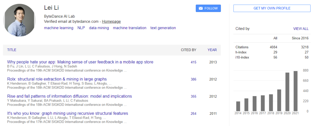 谷歌学术显示,其学术成果共获得4084个引用,高引用论文大多数是在2016年之后获得,而2016年正是他刚刚加入字节跳动的时期,可见这五年来,李磊在字节跳动AI Lab的贡献和影响力。