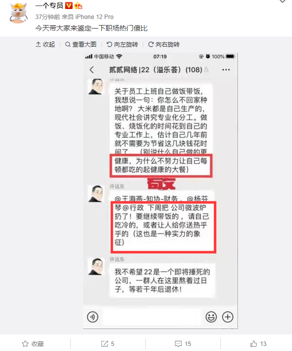 微博网友@一个专员爆料称,贰贰网络的聊天群里,老板许远东突然开始整治公司员工带饭热饭的问题,他对员工花时间在做饭、热饭上似乎很不满,要求行政部门将公司的微波炉扔掉,不再允许员工在公司热饭。