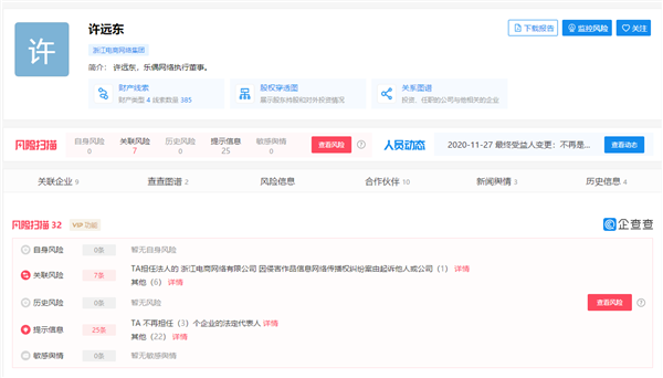 从企查查来看,贰贰网络是浙江一家互联网服务公司,旗下有75家公司,,注册资金2200万,许远东是最终受益人,持股49%,他担任法人及任职的公司涉及十几家,控制了82家企业。