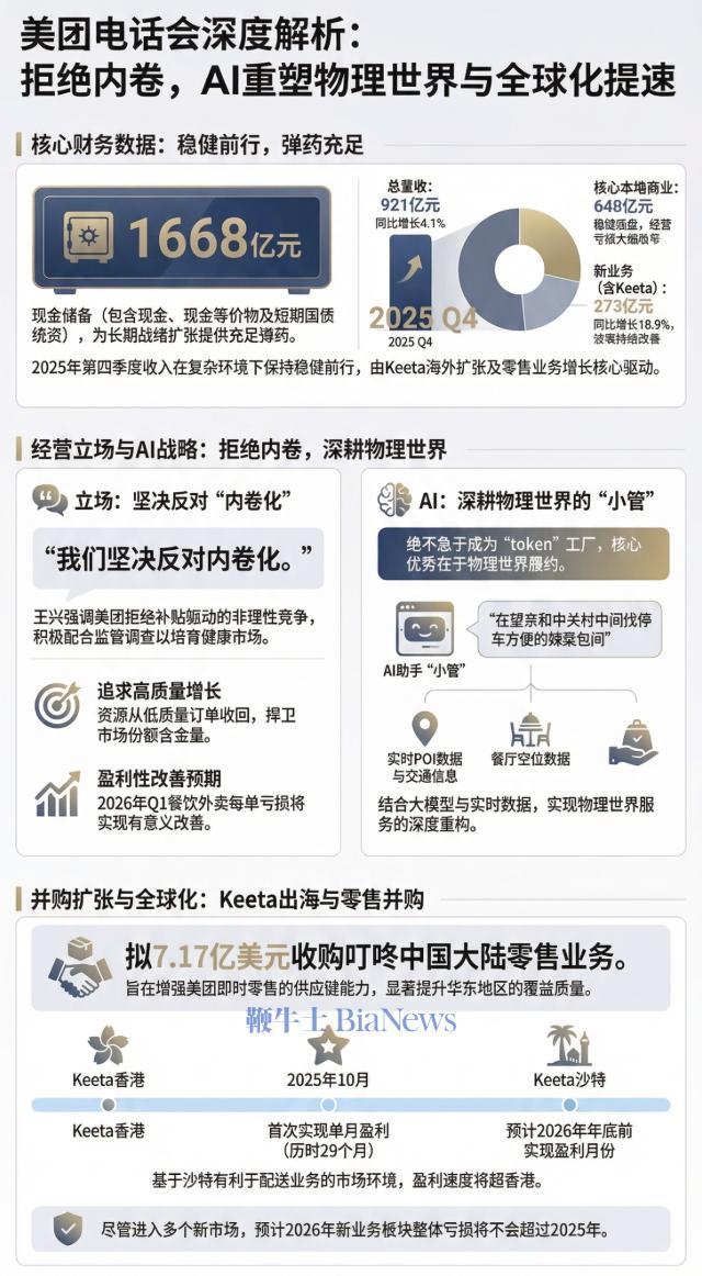 财报数据显示,美团2025年第四季度总收入达到921亿元,同比增长4.1%。截至2025年底,公司持有的现金及现金等价物和短期国债投资总计高达1668亿元。在各业务板块中,核心本地商业四季度收入为648亿元;而由Keeta和零售业务扩张驱动的新业务板块表现亮眼,四季度收入达到273亿元,同比增长18.9%。