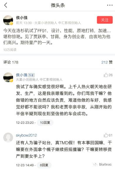 12月23日,侯小强发布微头条表示,当天在美国洛杉矶见到了贾跃亭及其妻子甘薇。