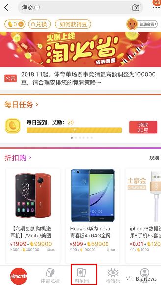 以淘宝淘必中页面为例,可以看到页面底部有体育竞猜、游乐园、猜猜乐等几个板块,其中体育竞猜就是猜各大体育比赛结果、猜猜乐是猜最佳男女主角、最佳歌曲、股指等,均以豆为赌注。