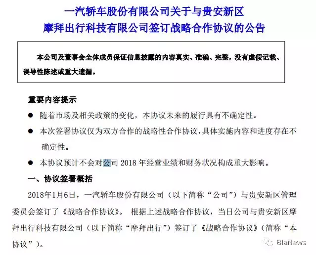 1月7日,一汽轿车发布公告称,一汽轿车与贵安新区摩拜出行科技有限公司签订了战略合作协议,一汽轿车拟对摩拜出行进行增资入股。增资后一汽轿车持有摩拜出行10%的股权。