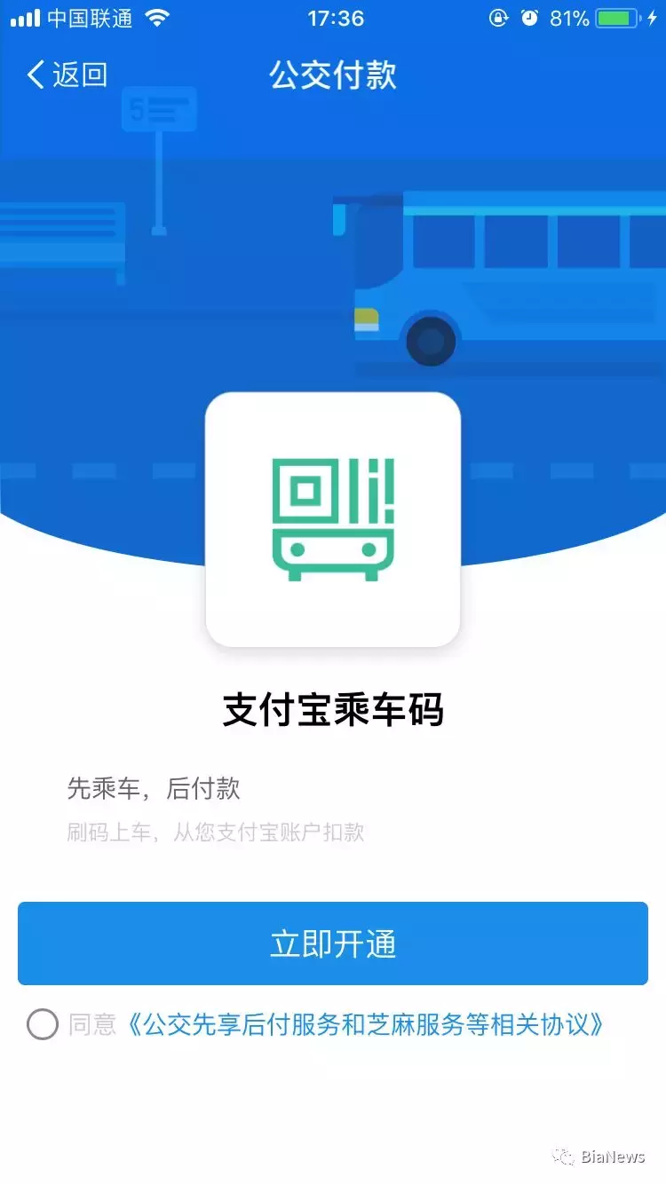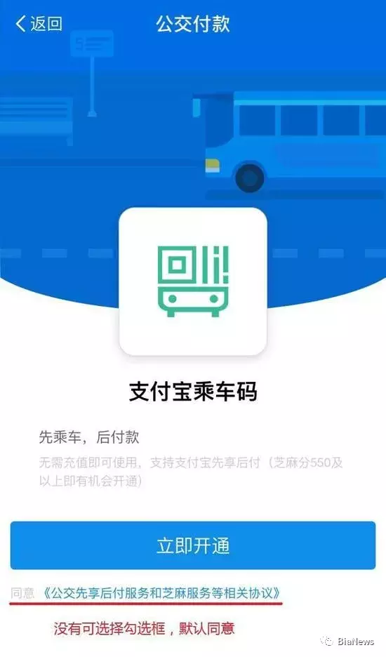 同时,Bianews试用支付宝在济南推出的乘车码时发现,页面的“默认同意”协议前已经添加了勾选框,用户勾选同意后方可开通使用。