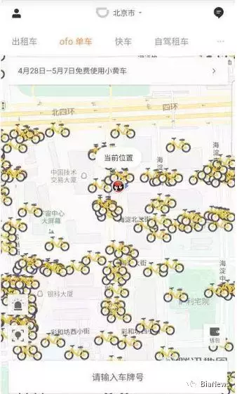 而此前,滴滴出行单车标签为“ofo单车”,同时,页面以黄色ofo单车图案标注单车定位。