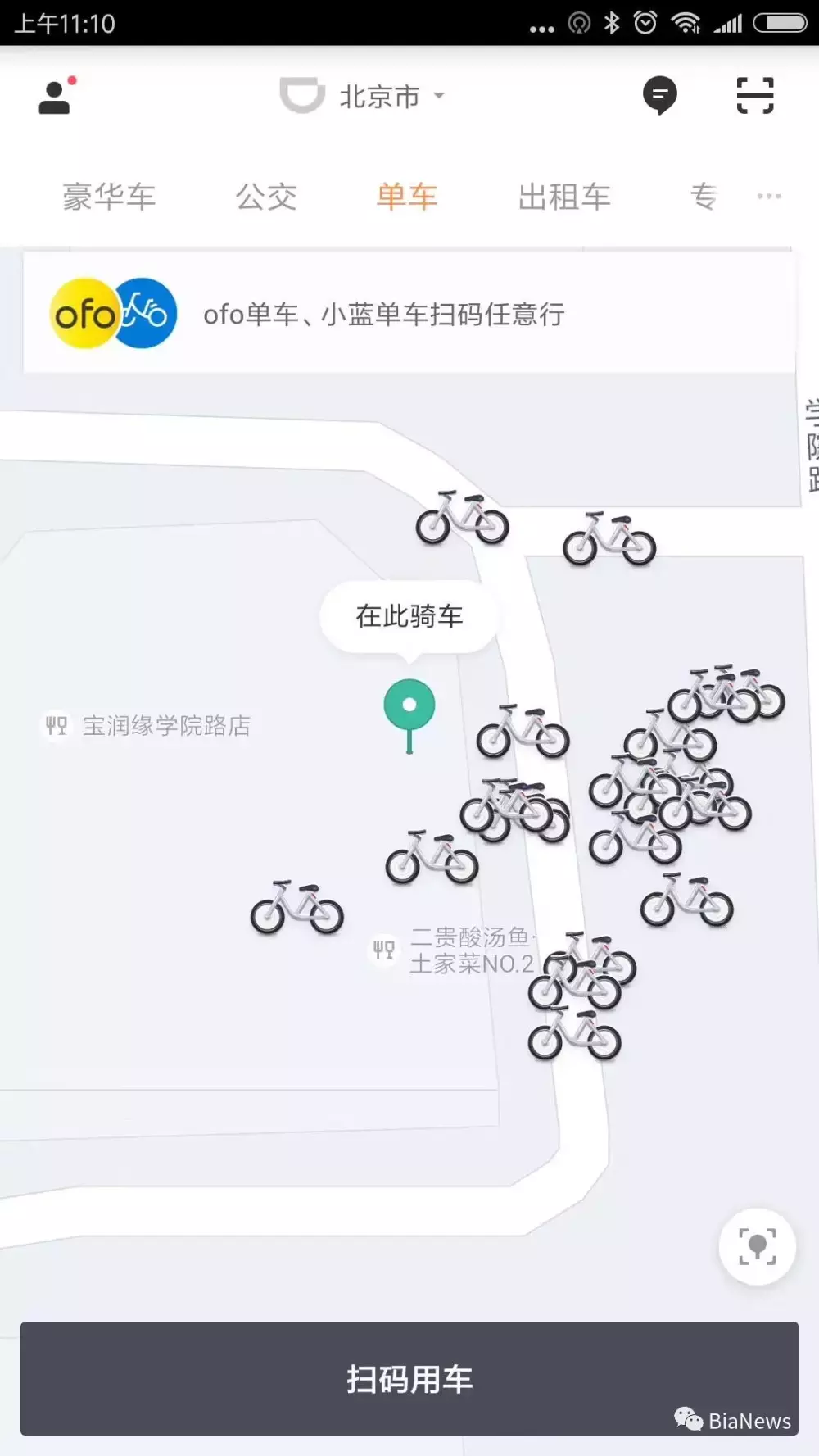 值得注意的是,此次开放共享单车平台后,滴滴出行App相关页面没有以颜色或图标形式区分ofo与小蓝单车,而以相同自行车标识来标注附近单车定位。