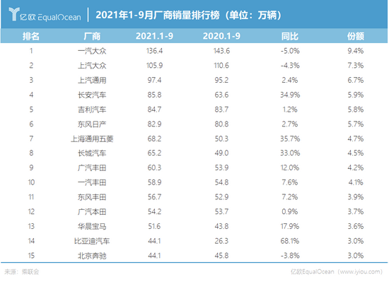 对比以上图表,不难发现,在新能源汽车领域有所斩获的汽车企业,今年1-9月的整体汽车销量也有一定增长。