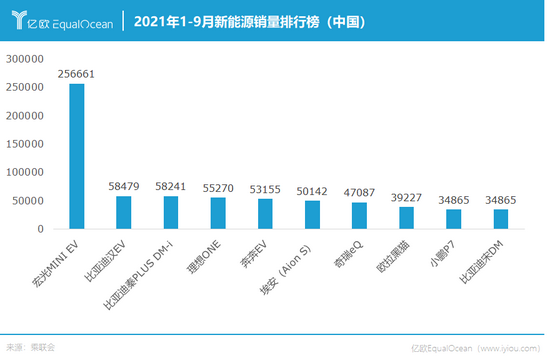 2021年1-9月新能源汽车零售销量排行榜显示,比亚迪旗下有三款车型销量位居前十,比亚迪汉EV凭借近6万辆的销售成绩位居第二。
