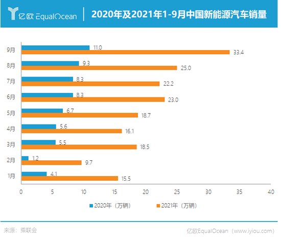 2021年1-9月,中国汽车市场乘用车零售量同比增长12%,而增长的155万辆汽车中,新能源汽车占94%,增量为139万辆。新能源车国内零售渗透率达到了22.1%,较之2020年5.8%的渗透率,提升幅度亮眼。