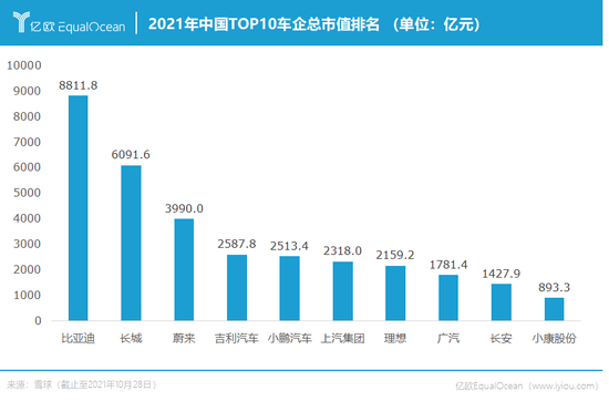截至10月28日,在中国车企市值排名中,比亚迪高居榜首。造车新势力蔚来、小鹏、理想稳居前十。老牌车企长城、吉利、上汽、广汽、长安已经早早布局新能源领域,加入了新能源的浪潮。