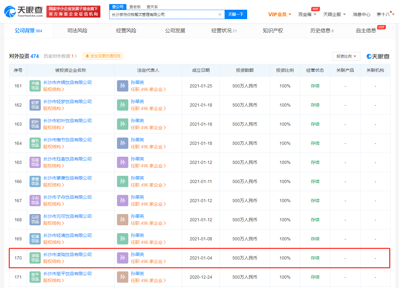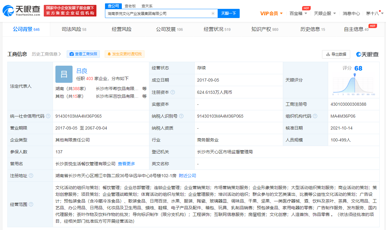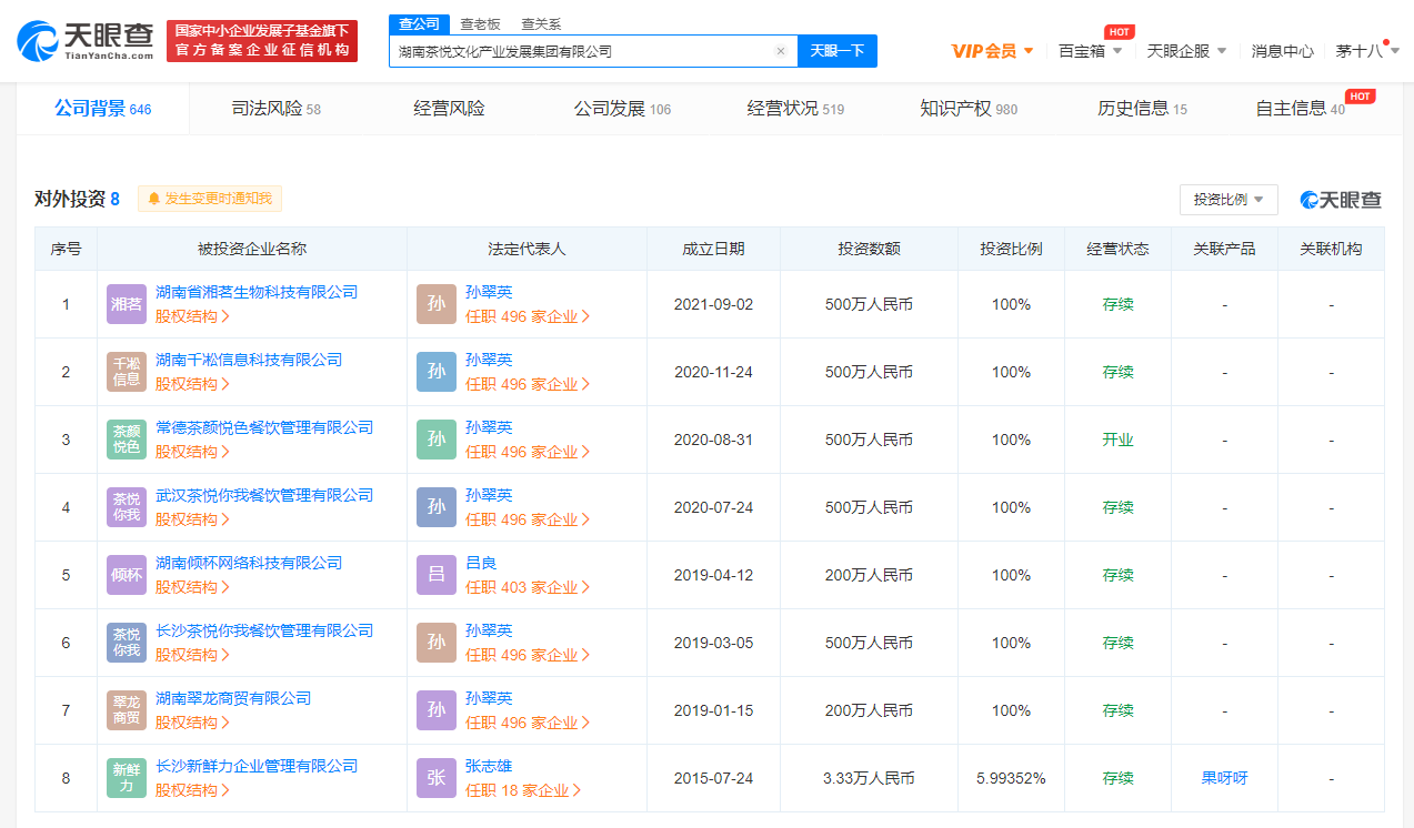 天眼查App显示,茶颜悦色运营主体湖南茶悦文化产业发展集团有限公司成立于2017年9月,吕良为该公司法定代表人及疑似实际控制人。目前该公司对外投资8家公司,其中7家为全资子公司,包括长沙茶悦你我餐饮管理有限公司、武汉茶悦你我餐饮管理有限公司等。长沙茶悦你我餐饮管理有限公司在长沙市已投资成立超470家全资子公司,其中170家茶颜悦色相关饮品公司成立于今年,占比超36%。