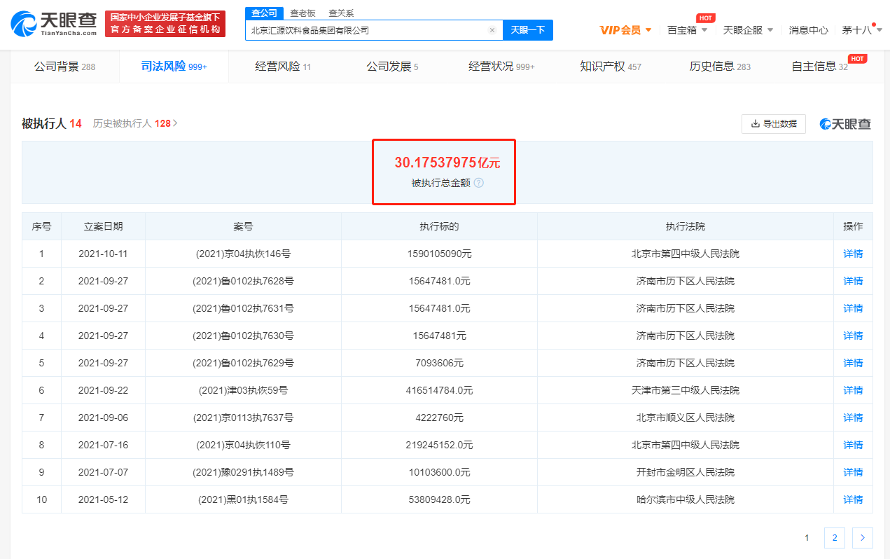 鞭牛士 11月11日消息,天眼查App显示,近日,涉及北京汇源饮料食品集团有限公司的执行裁定书公布,相关案号为(2021)京0113执7637号,审理法院为北京市顺义区人民法院。