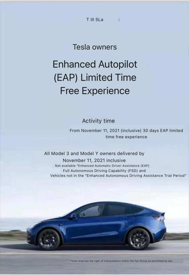 特斯拉中国称,在11月11日之前收到Model 3和Model Y的特斯拉车主,如果他们没有选购增强版自动辅助驾驶功能或全自动驾驶功能(FSD),则可以享受为期30天的EAP免费试用权。