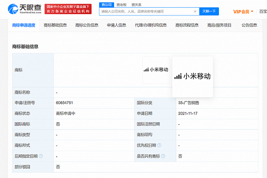 鞭牛士 11月22日消息,据天眼查App显示,近日,小米科技有限责任公司申请多个“小米移动”商标及图形商标,国际分类涉及广告销售、通讯服务、科学仪器等。目前商标状态为申请中。