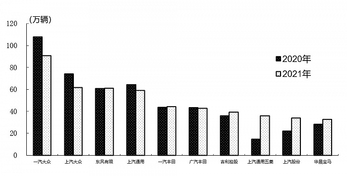 在销量排名前十位的轿车生产企业中,与上年同期相比,一汽大众、上汽大众销量呈较快下降,上汽通用和广汽丰田降幅略低,其他企业均呈增长,上汽通用五菱增速最为显著。