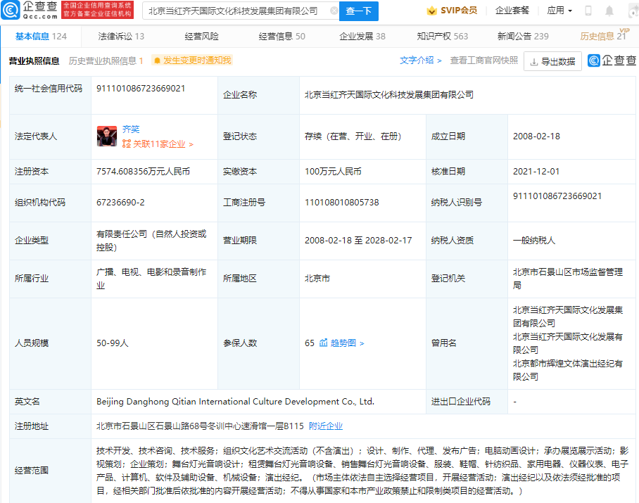 企查查信息显示,当红齐天是一家VR与AR线下社交娱乐体验服务提供商,公司成立于2008年,法定代表人为齐笑,经营范围包含:电脑动画设计;承办展览展示活动;影视策划;企业策划等。值得一提的是,张艺谋对该公司持股5.14%。