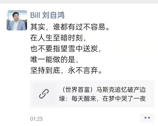 12月9日凌晨1:23分,柔宇科技创始人、董事长兼CEO刘自鸿在个人社交媒体上引述《马斯克追忆破产边缘:每天醒来,在梦中哭了一夜》,并发文表示:其实,谁都有过不容易。在人生至暗时刻,也不要指望雪中送炭,唯一能做的是,坚持到底,永不言弃。