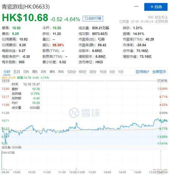 12月15日,关于青瓷游戏,富途证券暗盘交易显示报价11.38港元,较招股价11.2港元仅仅微涨1.61%。12月16日,青瓷游戏更是遭遇开盘破发,至当日港股收盘,青瓷游戏报收10.68港元,跌4.64%,总市值降为73.16亿港元。