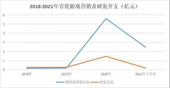 2018至2020年以及2021年上半年,青瓷游戏的销售及营销开支分别为0.14亿元、0.17亿元、5.59亿元以及2.45亿元;而同期青瓷游戏的研发开支分别为2530.5万元、2561.2万元、1.46亿元、1804.3万元。
