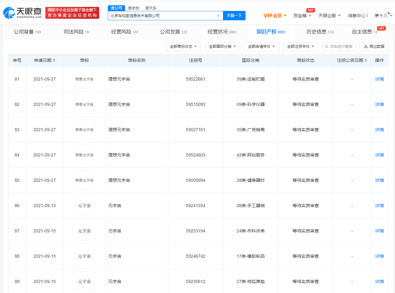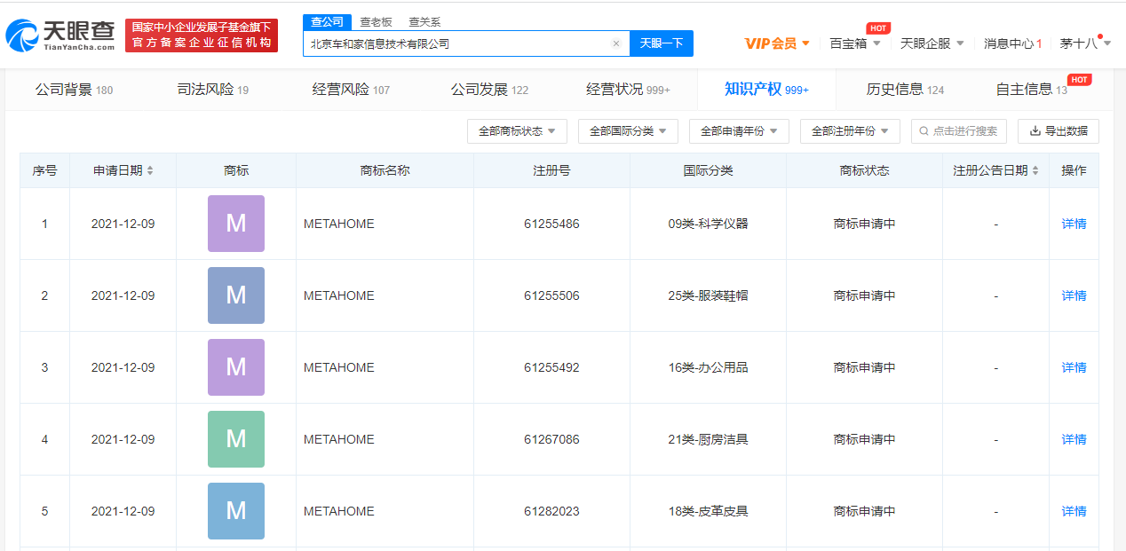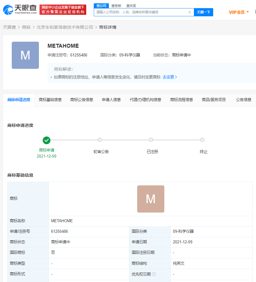 鞭牛士 12月17日消息,天眼查App显示,近日,理想汽车关联公司北京车和家信息技术有限公司申请注册“METAHOME”商标,国际分类涉及科学仪器、广告销售、办公用品等,目前商标状态均为申请中。值得一提的是,该公司还曾申请元宇宙、理想元宇宙等商标。