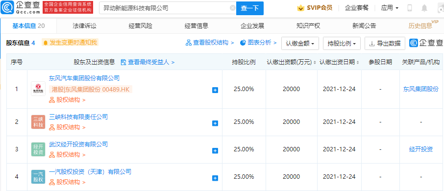 企查查股权穿透显示,该公司由东风集团股份(00489.HK)、一汽股权投资(天津)有限公司等共同持股。