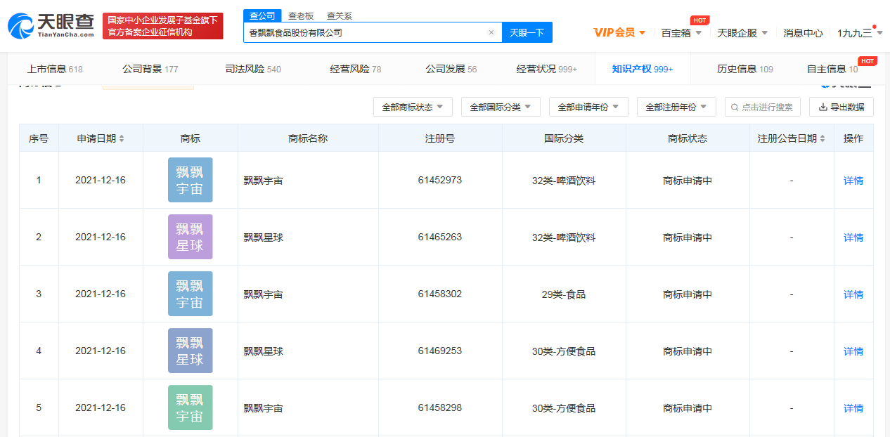 鞭牛士 12月27日消息,天眼查App显示,近日,香飘飘食品股份有限公司申请注册多个“飘飘宇宙”“飘飘星球”商标,国际分类为啤酒饮料、方便食品等,当前商标状态均为申请中。