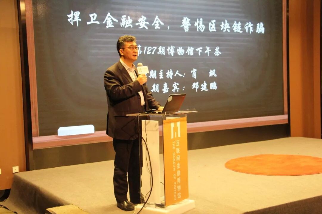 2018年3月30日,第127期下午茶在互联网金融博物馆举办,本次主题为“捍卫金融安全,警惕区块链诈骗”,主讲人为中央民族大学法学院教授、中国互联网金融创新研究院副院长邓建鹏,互金法律专家肖飒担任特邀主持人,北京市金融工作局党组书记、局长霍学文、中国金融博物馆理事长王巍致辞发言,其中霍局长九问区块链,引起热烈讨论。