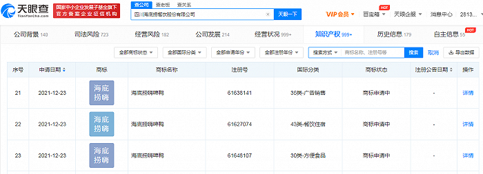 鞭牛士 1月4日消息,天眼查App显示,2021年12月23日,四川海底捞餐饮股份有限公司申请注册多个“海底捞嗨啤鸭”商标,国际分类含食品、啤酒饮料、广告销售等,当前商标状态均为申请中。