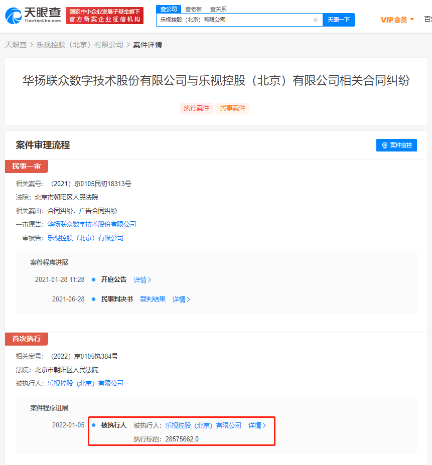乐视控股再被强制执行2857万,被执行总金额超43亿