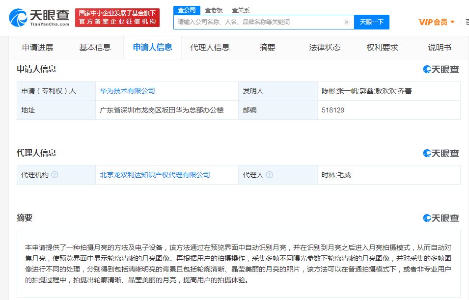 鞭牛士 1月11日消息,天眼查App显示,今日,华为技术有限公司获得“一种拍摄月亮的方法和电子设备”专利授权。