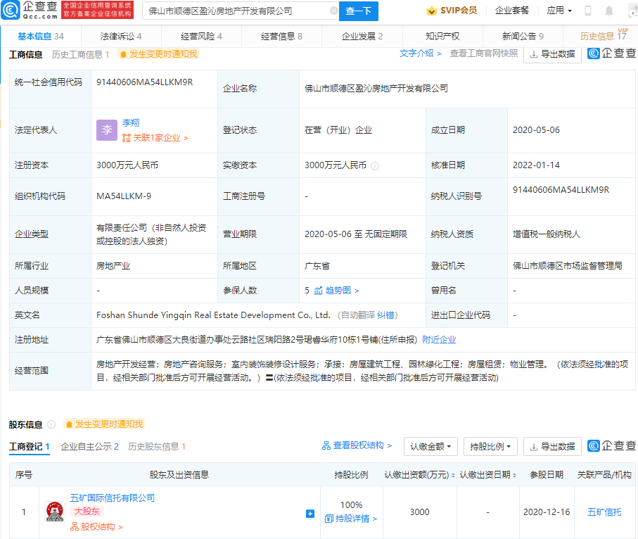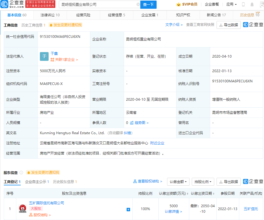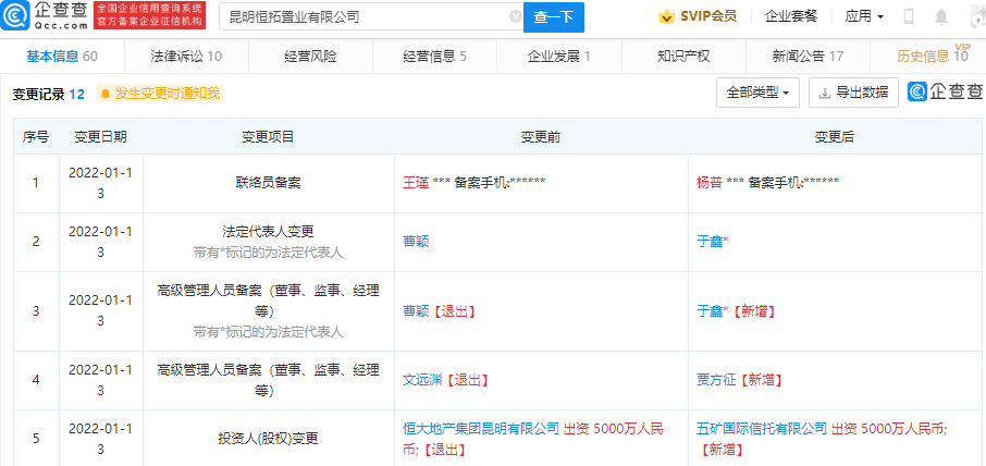 鞭牛士 1月17日消息,企查查APP显示,近日,昆明恒拓置业有限公司、佛山市顺德区盈沁房地产开发有限公司发生工商变更,前者股东恒大地产集团昆明有限公司退出100%股权,后者股东恒大地产关联公司佛山市南海俊凯房地产开发有限公司退出49%股权,二者均由五矿国际信托有限公司接盘。