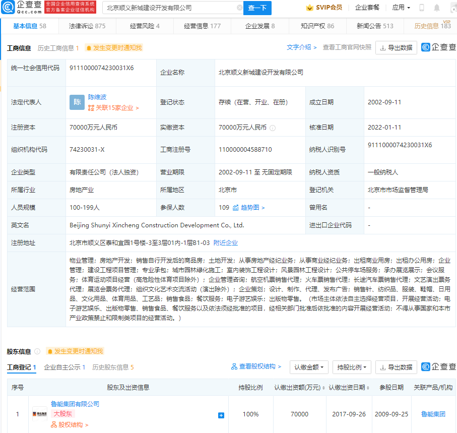 企查查信息显示,该公司成立于2002年,法定代表人为陈维波,注册资本7亿元人民币,经营范围包含:物业管理;房地产开发;销售自行开发后的商品房;土地开发;从事房地产经纪业务等。