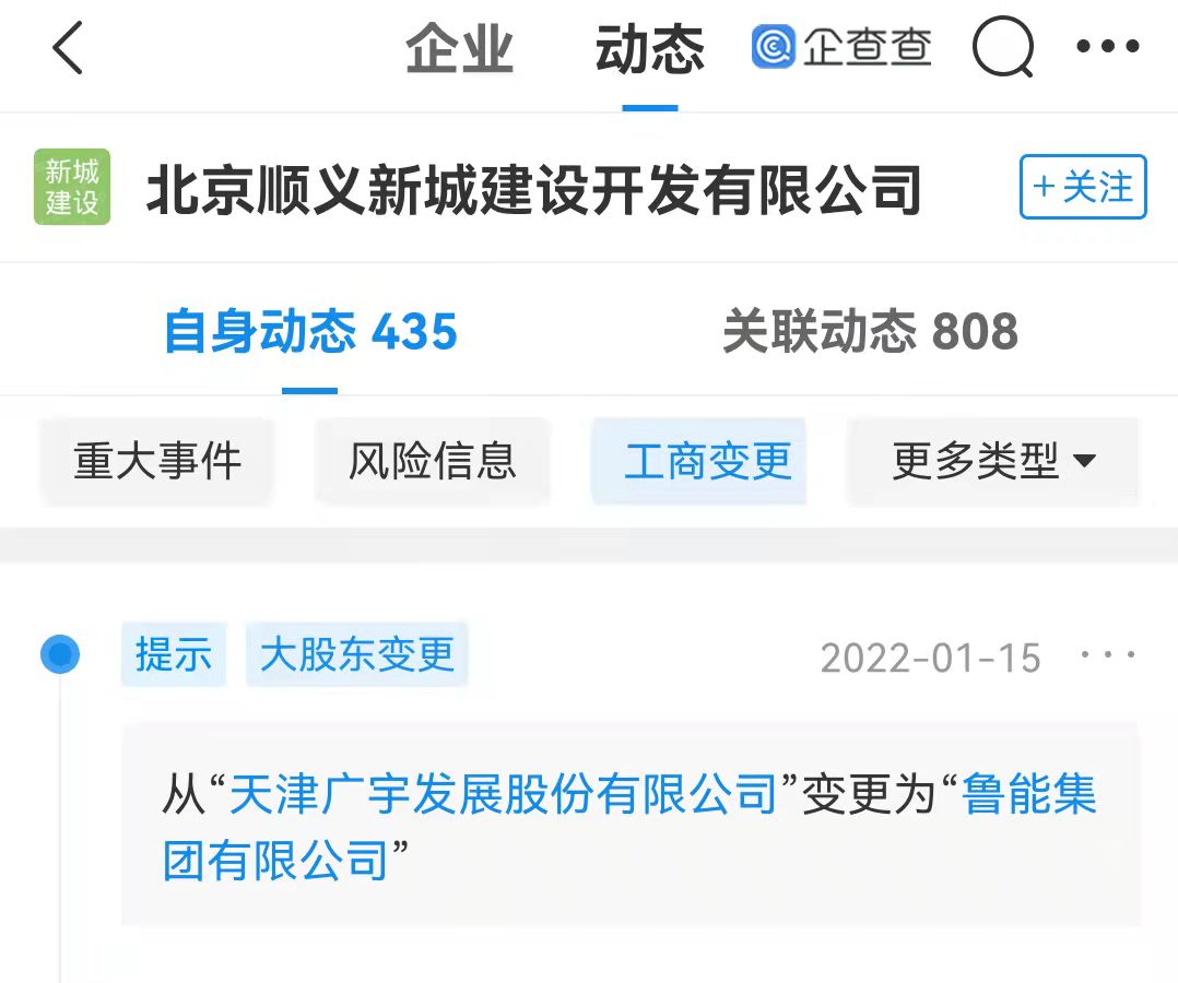 鞭牛士 1月17日消息,企查查APP显示,近日,北京顺义新城建设开发有限公司发生工商变更,广宇发展(000537)退出股东,新增股东鲁能集团有限公司,持股100%。