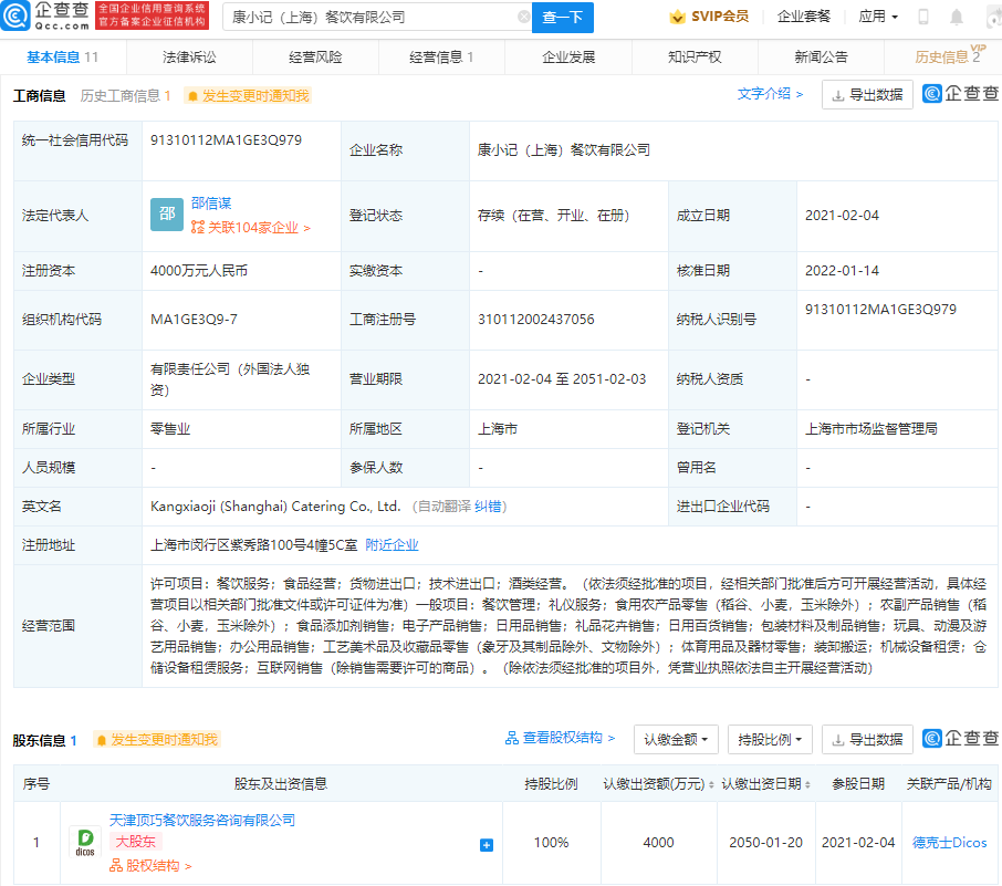 企查查信息显示,该公司成立于2021年2月,法定代表人为邵信谋,经营范围包含:餐饮服务;食品经营;货物进出口;技术进出口;酒类经营等,由天津顶巧餐饮服务咨询有限公司100%控股。