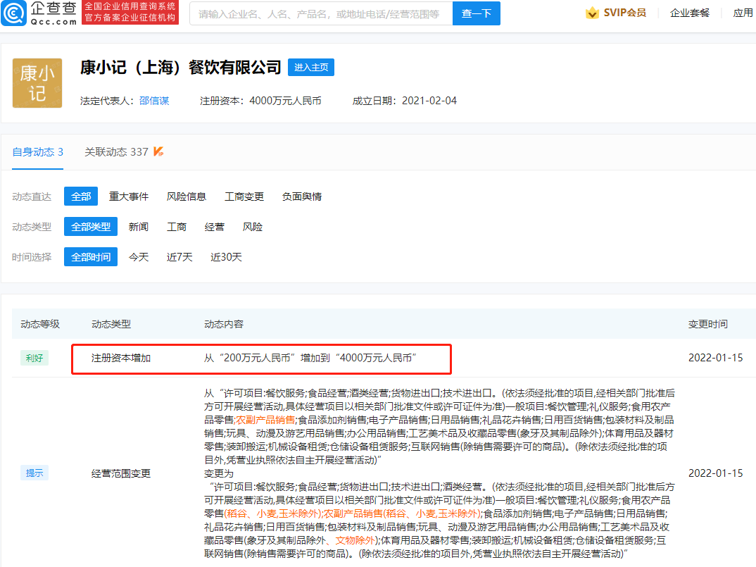 鞭牛士 1月17日消息,企查查APP显示,近日,德克士关联公司康小记(上海)餐饮有限公司发生工商变更,公司注册资本由200万元人民币增加至4000万元人民币,增幅1900%。