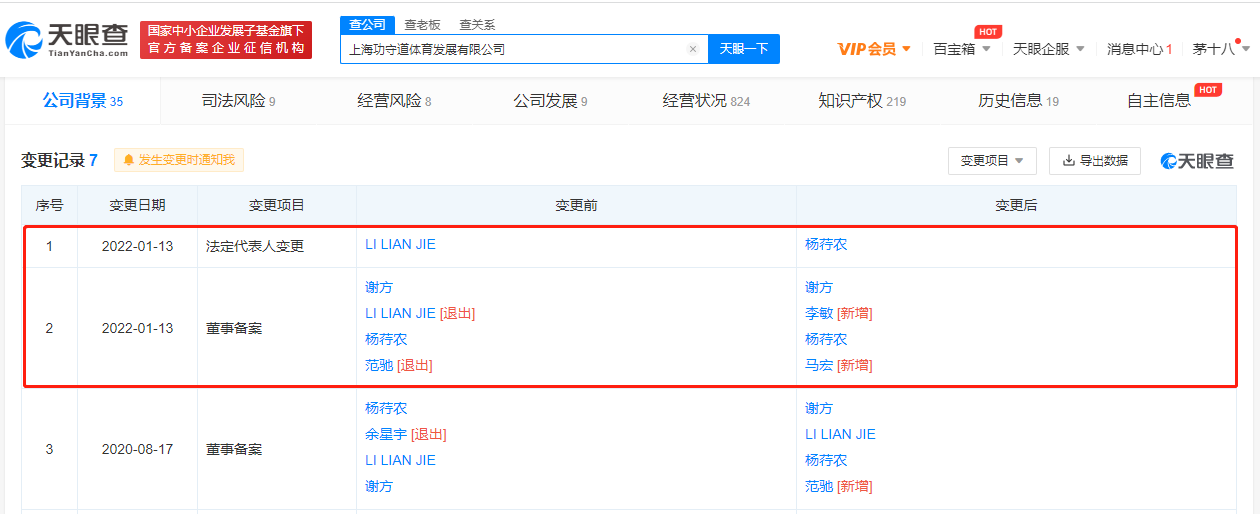 鞭牛士 1月17日消息,天眼查App显示,近日,上海功守道体育发展有限公司发生工商变更,法定代表人由LI LIAN JIE变更为杨荇农;同时LI LIAN JIE等人退出董事职位,新增人员为李敏、马宏。