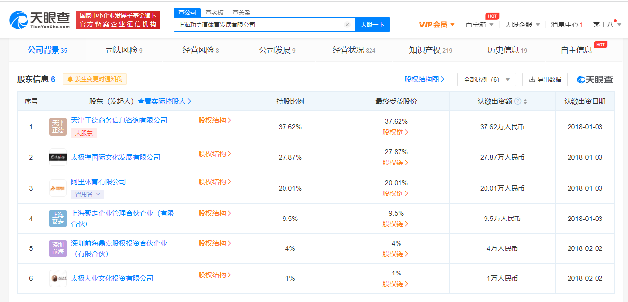 上海功守道体育发展有限公司成立于2018年1月,注册资本100万人民币,经营范围包括体育经纪;体育赛事活动策划等。股东信息显示,该公司股东包括阿里体育有限公司等。