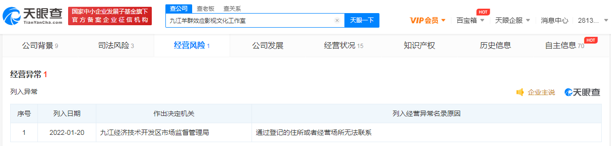 鞭牛士 1月21日消息,近日,九江酷酷熊影视文化工作室、九江羊群效应影视文化工作室被列入经营异常名录,原因为“通过登记的住所或者经营场所无法联系”。上述两家工作室均成立于2017年6月,为郑爽个人独资企业。